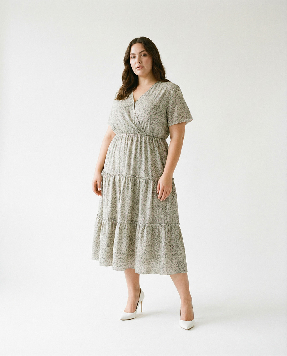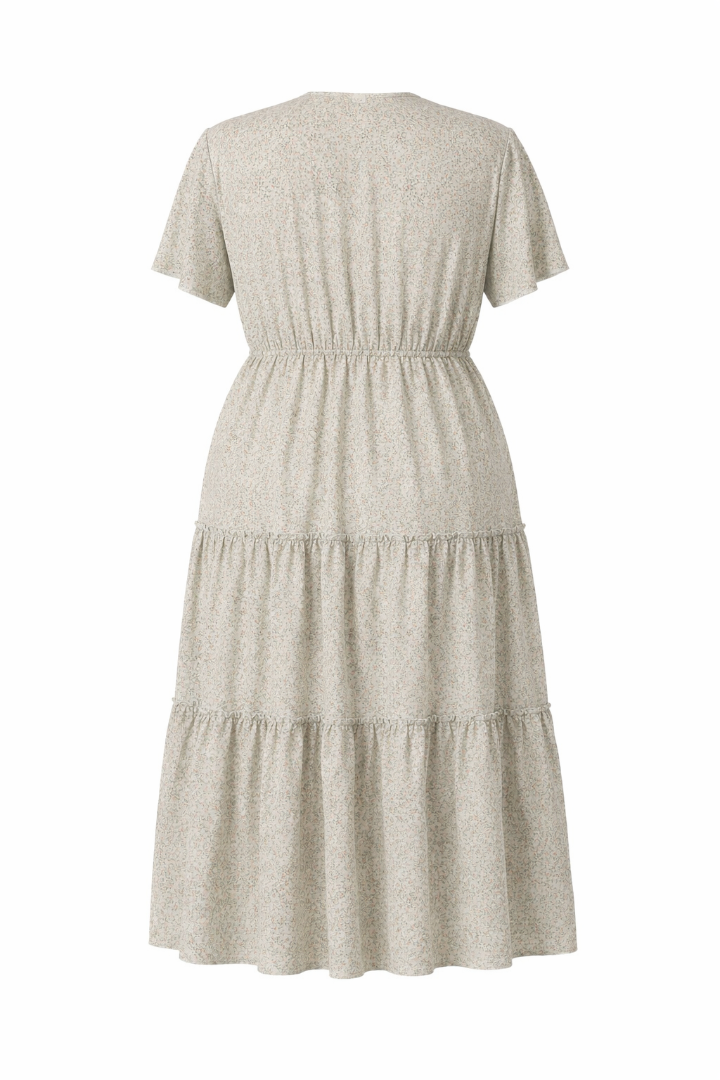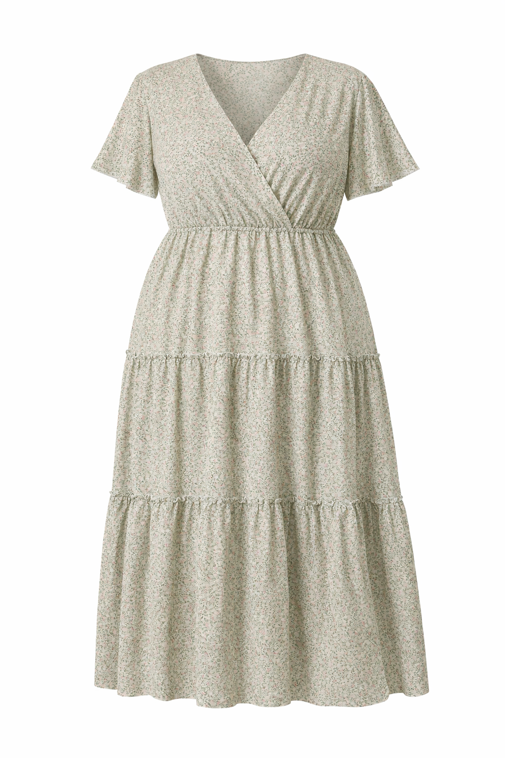 Dieses Bloom feminine Kleid in zartem Salbeigrün überzeugt mit einem feinen floralen Muster und einer fließenden Silhouette. Der schmeichelnde V-Ausschnitt und die kurzen Ärmel verleihen dem Design eine leichte, sommerliche Ausstrahlung, während die elastische Taille für angenehmen Tragekomfort sorgt.