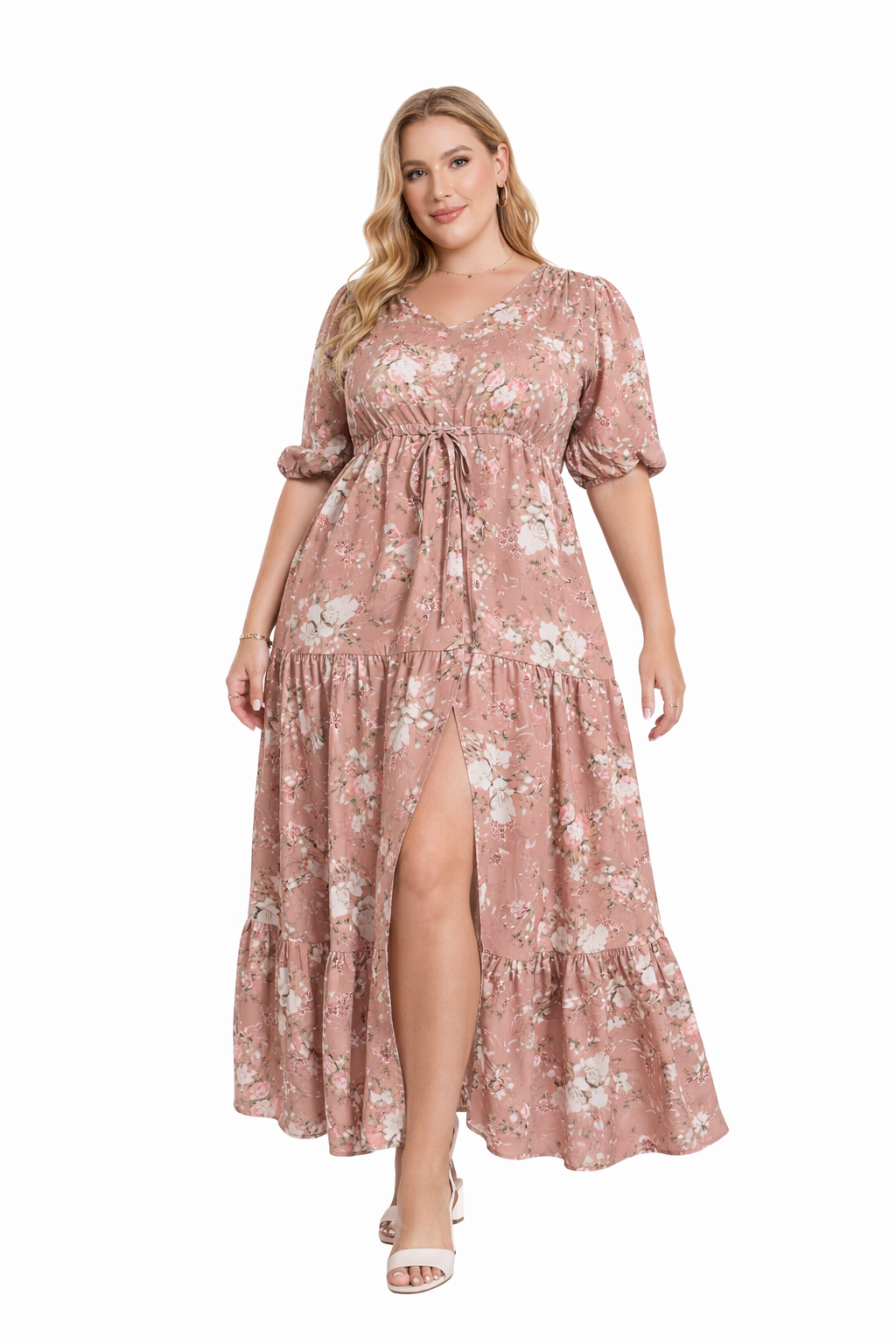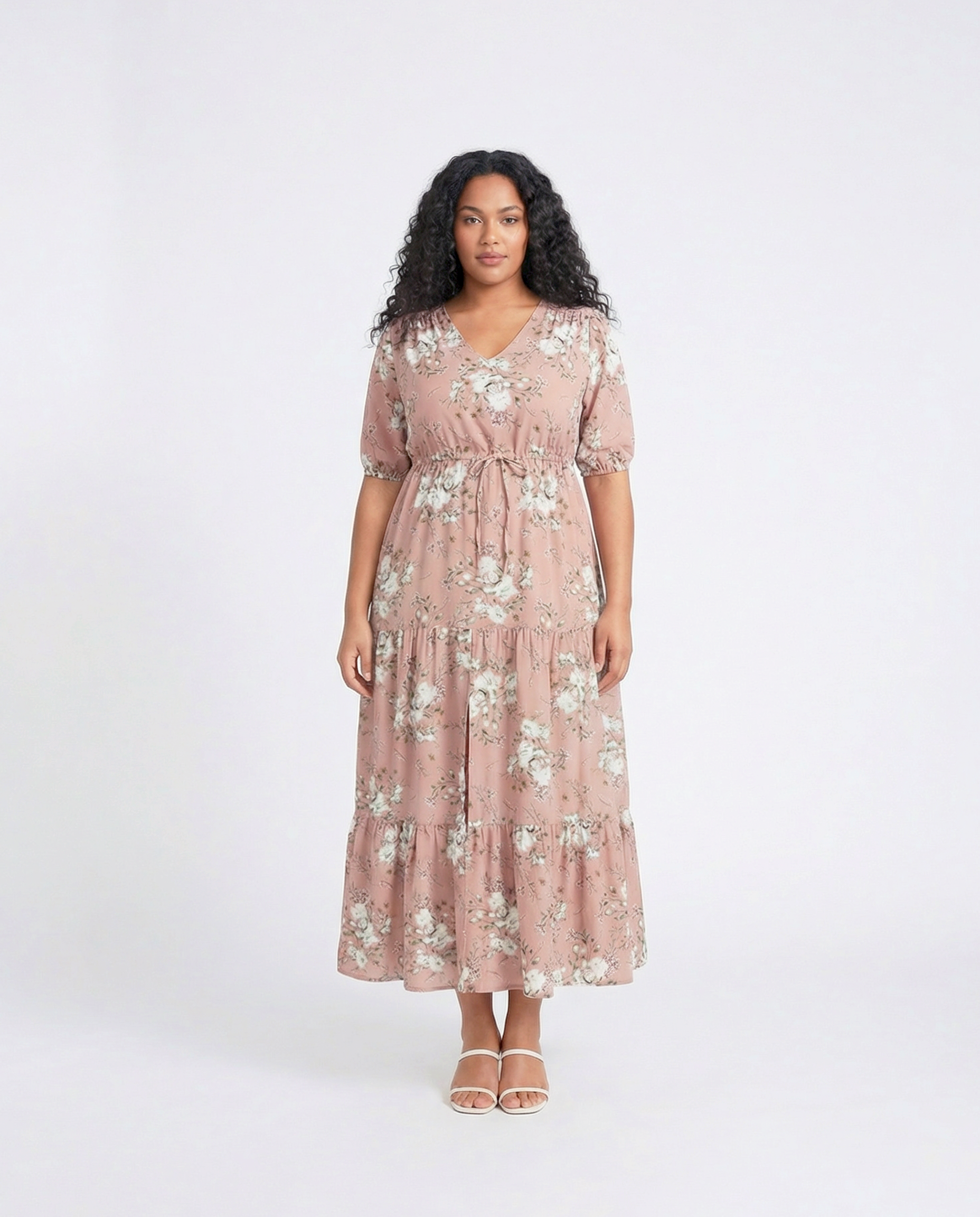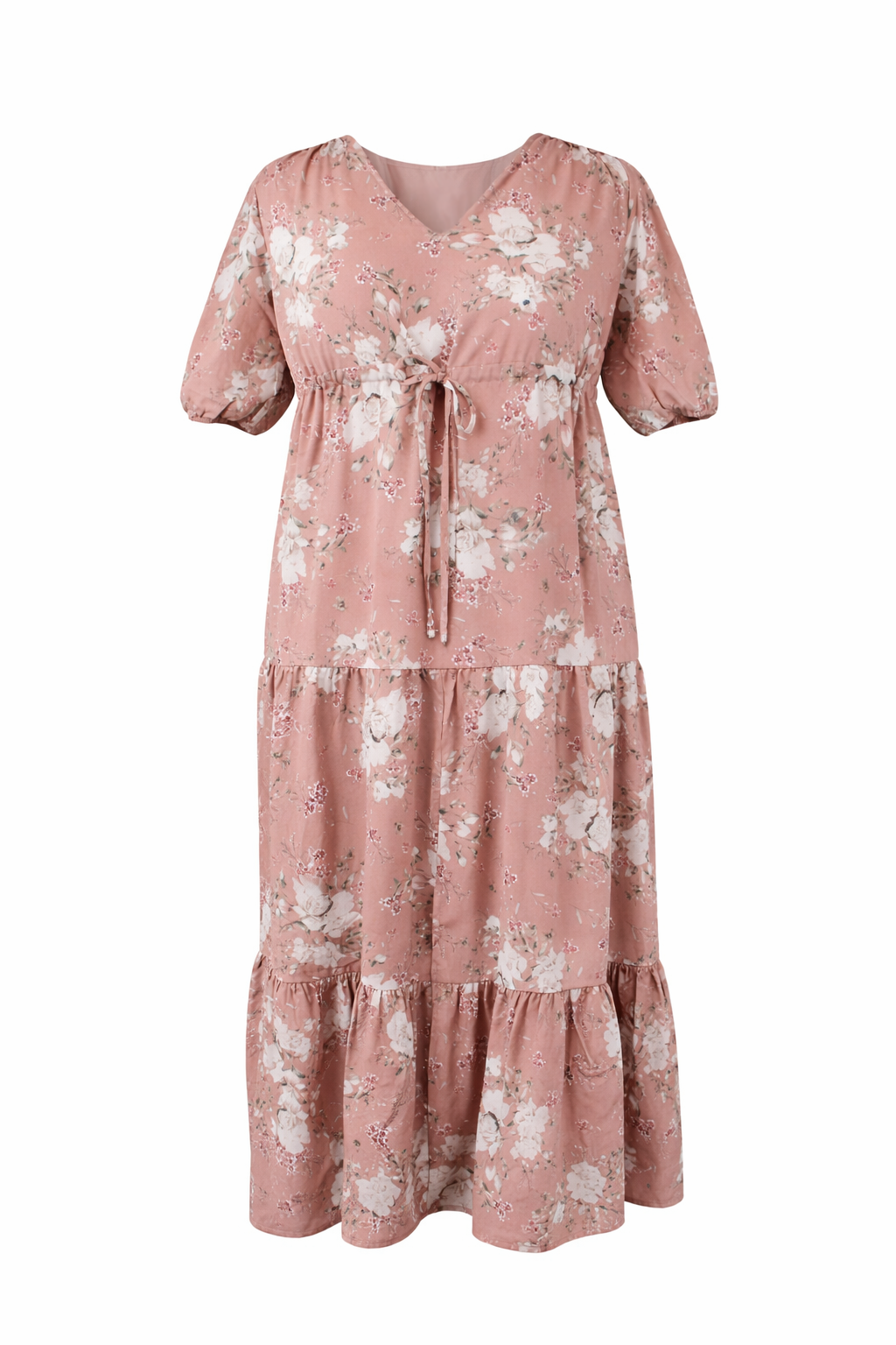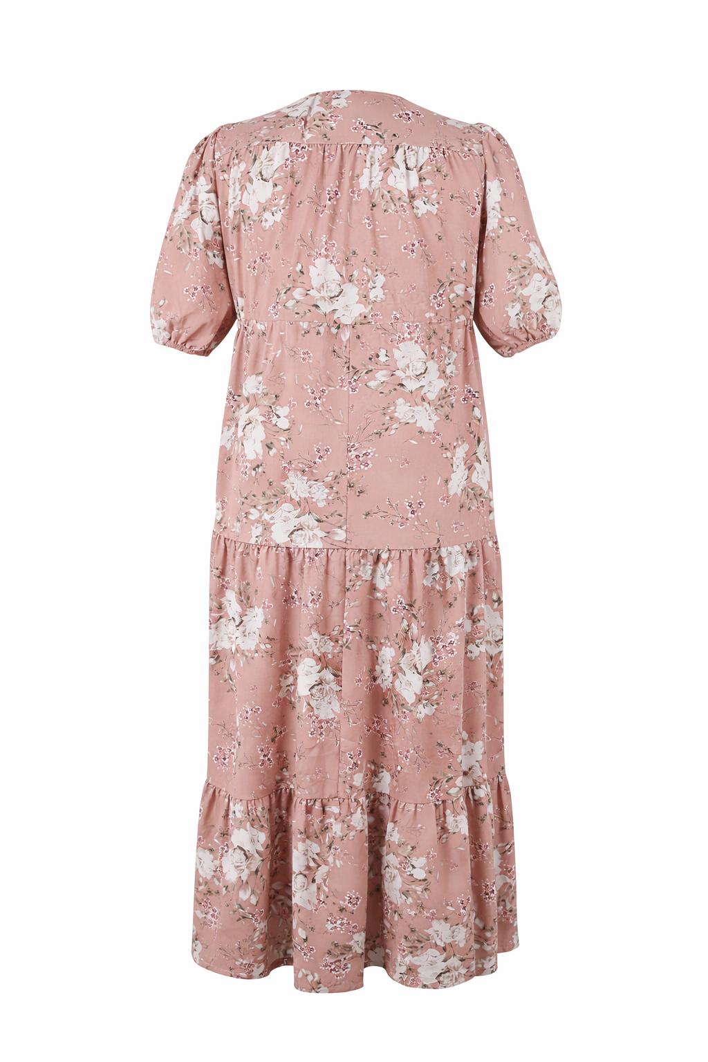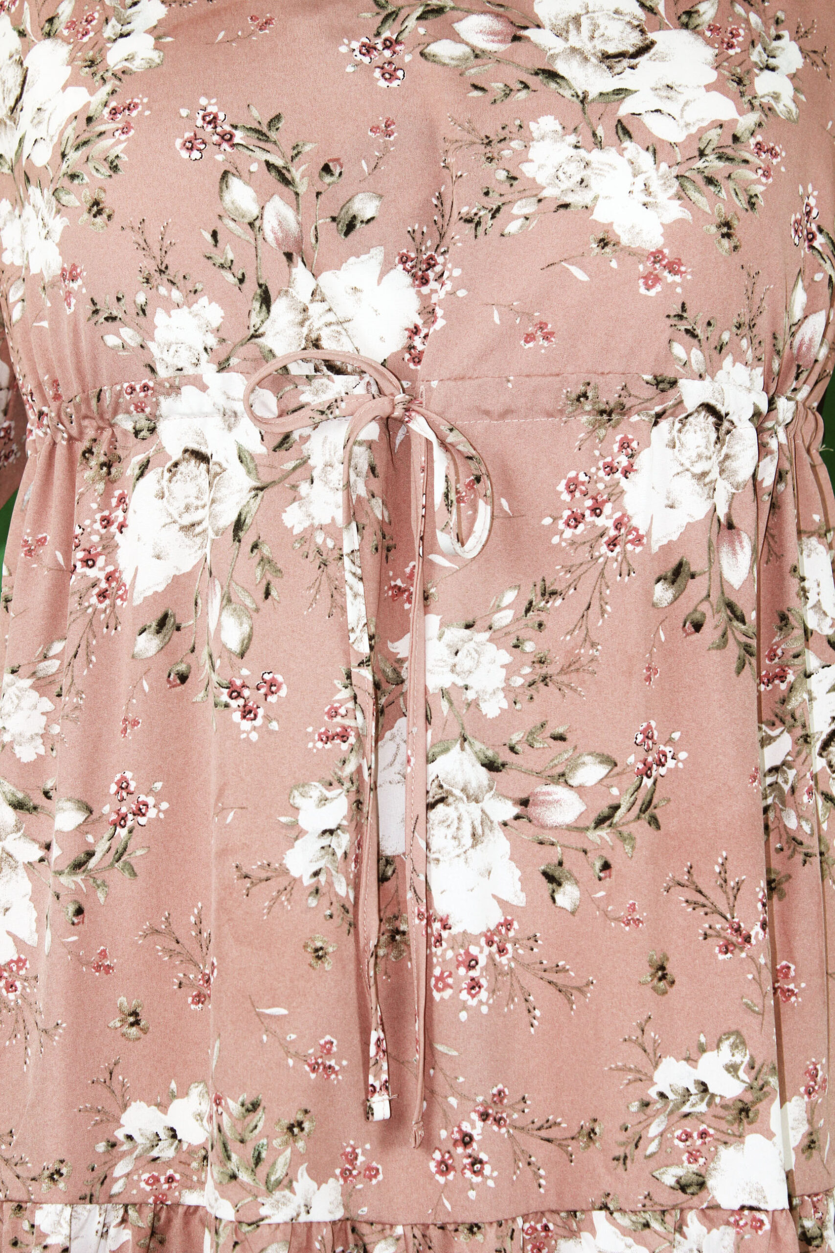 Der zarte Blumenprint in warmen Rosé-Tönen verleiht dem Kleid eine feminine und zeitlose Ausstrahlung.