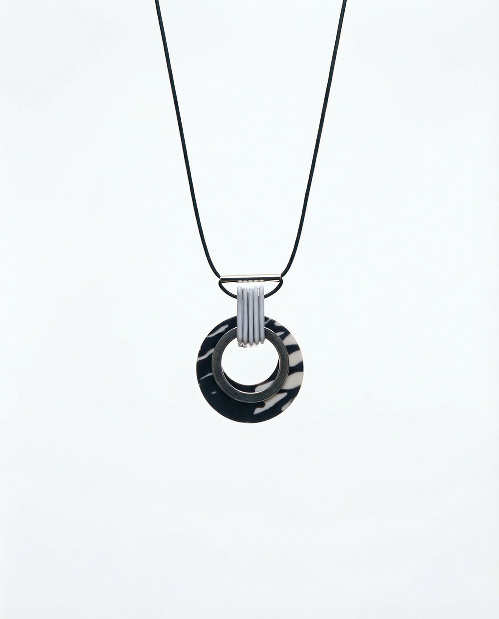 Eine moderne Statement-Halskette mit grafischem Kreis-Element in Schwarz mit feiner Marmorierung.